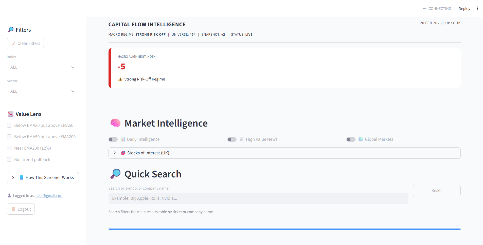 Our Market Intelligence Screener is a regime-aware, data-driven stock discovery tool designed to identify high-probability opportunities before they become obvious. Powered by structured EMA trend logic, pullback detection, volatility profiling, earnings and news filters, the screener highlights institutional-quality setups aligned with current market conditions. Whether markets are risk-on, risk-off, or transitioning, the platform dynamically adapts — surfacing strong trend leaders, controlled pullbacks, and macro-sensitive rotations in real time. Built for disciplined traders who value structure over noise.