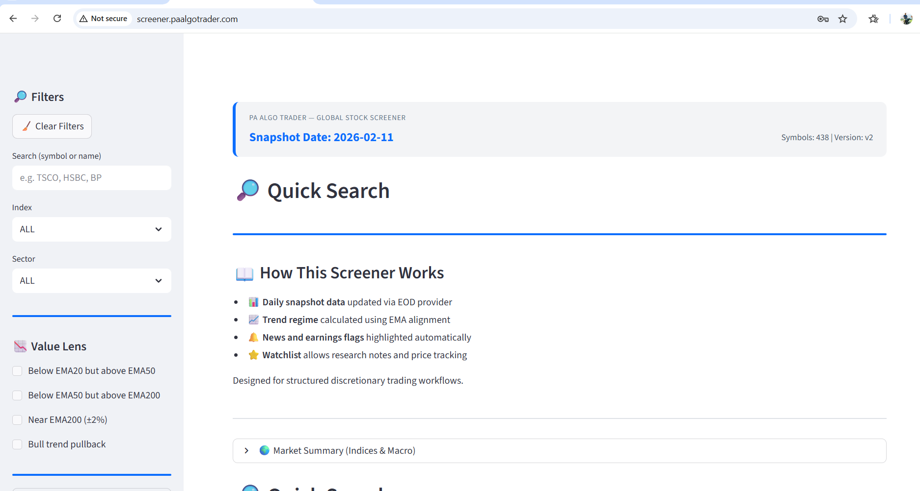 The PA Algo Trader Global Stock Screener is designed as a structured decision-support tool for traders who want clarity before committing capital.